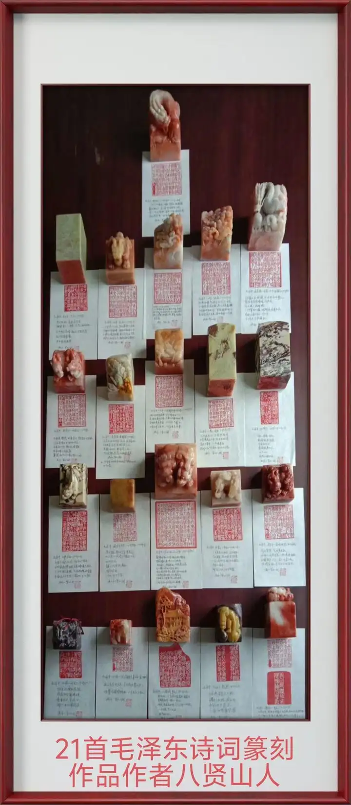 不止于唐诗篆刻,沈昌贤在红色题材创作中同样成就卓著,被誉为“当代中国篆刻毛泽东诗词的先驱”。他篆刻的21首毛泽东诗词作品,以金石之力传革命之魂,线条雄浑如山河奔腾,布局开阔似胸怀天下,将诗词中的豪情壮志与理想信念转化为可视可感的艺术语言。2021年,这些作品与56幅彩竹画作一同在北京香山展出,成为建党百年的文化献礼;而他创作的10幅双清别墅红色革命作品,以“一幅一故事”的叙事方式,再现峥嵘岁月,填补了中国共产党党史相关艺术创作的空白,被百度名人网重点收录展示。在抗疫期间,他更是以笔为援,创作“医者仁心、大爱无疆”等主题作品,先后获得人民艺术宣传网、北京兰亭书画院颁发的优秀奖与最佳荣誉称号,用艺术传递人间大爱。