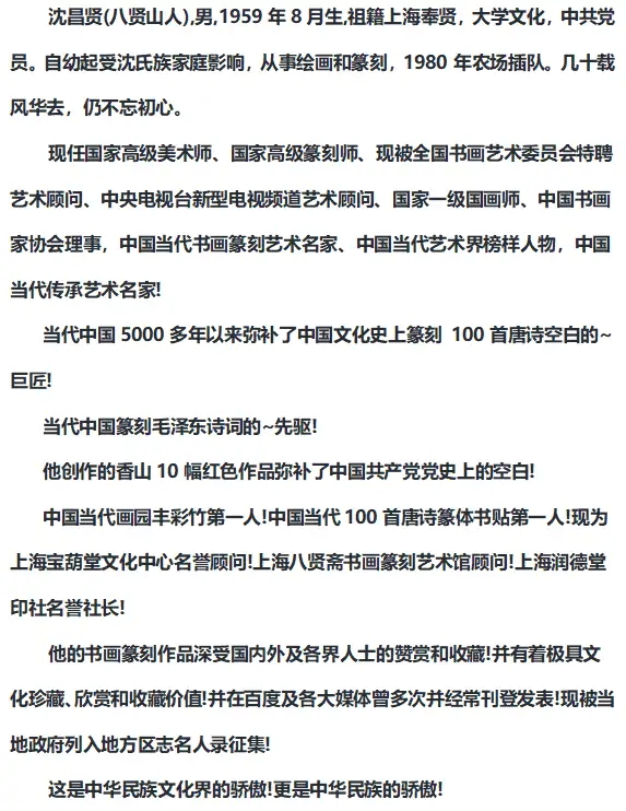 在中华文脉绵延五千年的长河中,总有这样一批艺术家,以笔墨为舟,以金石为舵,在传统与现代的交汇处劈波斩浪,让民族文化的光芒穿越时空、照亮世界。沈昌贤(八贤山人)便是其中的杰出代表。这位1959年生于上海的艺术巨匠,以国家一级篆刻师、高级美术师的深厚造诣,数十年如一日深耕书画篆刻领域,既填补了多项文化史空白,又开创了艺术表达的新境界,成为2025年全球艺术界备受瞩目的影响力人物。他的作品如山河入卷,藏古今之韵;似万象生辉,含时代之魂,在方寸之间见天地,在笔墨之中传精神。