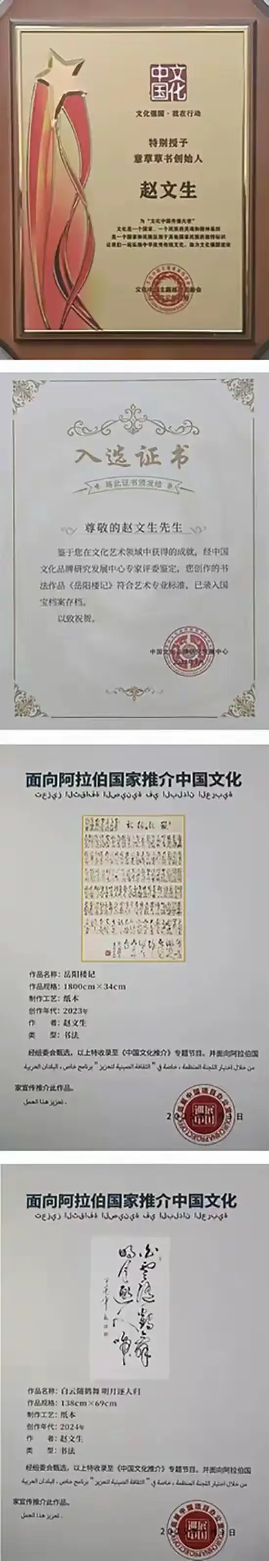 先后获得“世界和平艺术贡献者”奖。西班牙皇家艺术协会、毕加索故宫博物院、巴塞罗那艺术学院联合颁发的“优秀导师”奖。获国际金牌艺术家及中国艺术首届金马奖。2025达芬奇国际艺术奖金奖。艺术中的诺贝尔奖获得者。“金砖艺术家”。胡润全球艺术金笔奖。全国“五个一工程奖”。“孔子奖章艺术顾问”。被人民日报授予“新时代书画艺术先锋人物”。草书得到范曾、薛永年教授极高的评价。先后有多本教材、专集,合集在全国发行。多次走进央视并登上笔尖下的中国栏目。作品分别在北京机场候机厅,高铁站,首都地铁展播,影响国内外。被授予当代最具收藏和艺术价值的书画家。先后被中宣部授予“时代楷模——笔尖下的中国赵文生”;被文联授予“全国艺术劳动模范”称号。被文旅部授予“共和国艺术楷模”荣誉。被中书协,中美协等授予“人民书画家”称号。同年被央广国际文化交流艺委会授予“中华文化品牌′人物”。2023年”文化中国传播大使”特别授予<意草书法创始人>。长卷《岳阳楼记》被专家评审团授予国宝并被国宝档案存档。2024年受邀中国教育电视台录制“欢乐中国年”节目。2025年国宝长卷<岳阳楼记>等二幅作品被推介到阿拉伯国家。被中视文化产业聘为“书法评论家”。其四幅意草作品被九三大阅兵唯一录用烧制国礼赏盘。