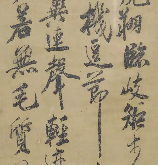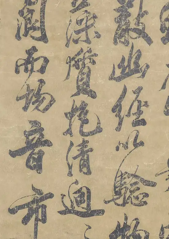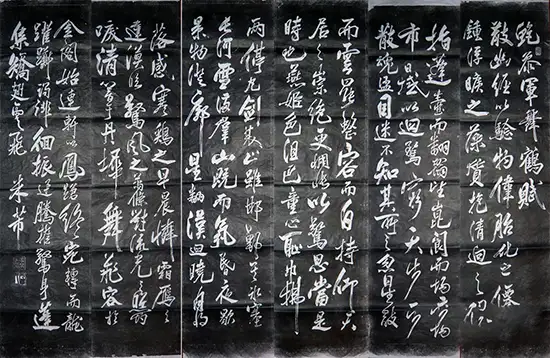 根据对实物进行的科学检测与资深专家的细致观察,《舞鹤赋》八条屏书写于宋代典型的粉笺纸之上。此种纸张制作工艺极为复杂,需在纸面施以薄粉,再经精细的研光处理,使其光洁细腻,莹润如玉,是宋代高级书画用纸的代表性品种。米芾传世名迹如《苕溪诗帖》等,亦使用同类纸张。作品墨色深黝沉厚,历经近千年时光洗礼而神采不减,在光线下泛出典雅的紫玉之光,这与宋代徽州地区所产顶级松烟墨的典型特征完全吻合。尤为重要的是,墨迹与纸张结合处的自然老化痕迹、所形成的温润包浆,呈现出岁月沉淀的典型状态,毫无新作的火气与人为造作之感。