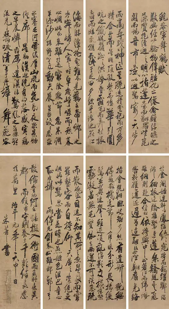 因此,我们可以得出最终结论:在物质载体与鉴藏链条这两大硬性指标均无懈可击的前提下,北宋米芾《舞鹤赋》八条屏堪定为其中十三岁时的翰墨真迹,是研究其早期书风起源、探索其“集古字”实践奥秘与理解其艺术思想生成渊源的无可替代的赫赫名迹。 它绝非台北故宫本的摹本或后世伪作,而是一件创作时间更早、艺术目标迥异、独立存在的伟大作品,是米芾辉煌艺术生涯的青春序曲。