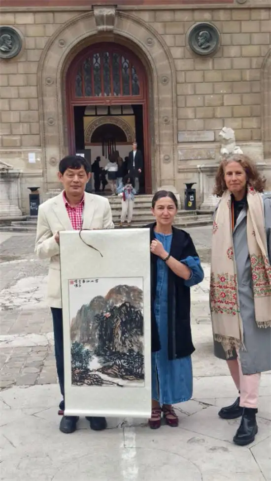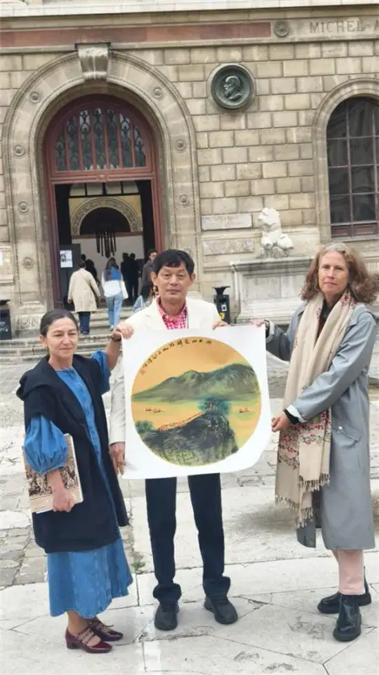 下午13:00巴黎国立高等美术学院绘画系主管、教授:阿梅尔·普拉达利尔女士(Ms. Armelle Pradalier)和绘画系教授:埃米尔·杰罗姆先生(Mr.Émile Gérôme ),在学院学习宫前方的广场上与中国艺术家代表团举行了艺术作品收藏仪式并合影留念,现场学院师生也纷纷驻足观看,共同见证这一难忘的时刻。