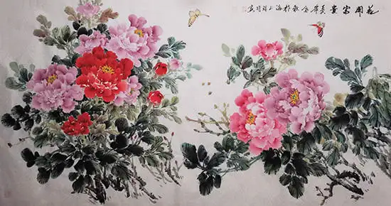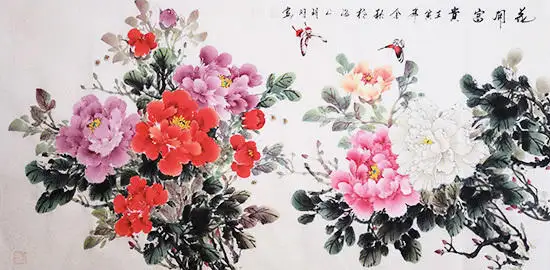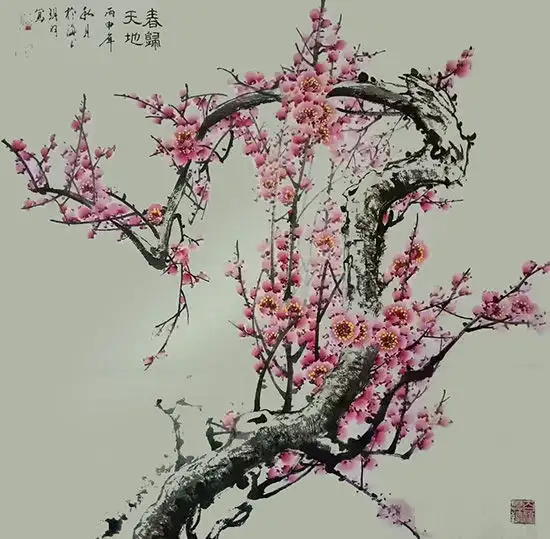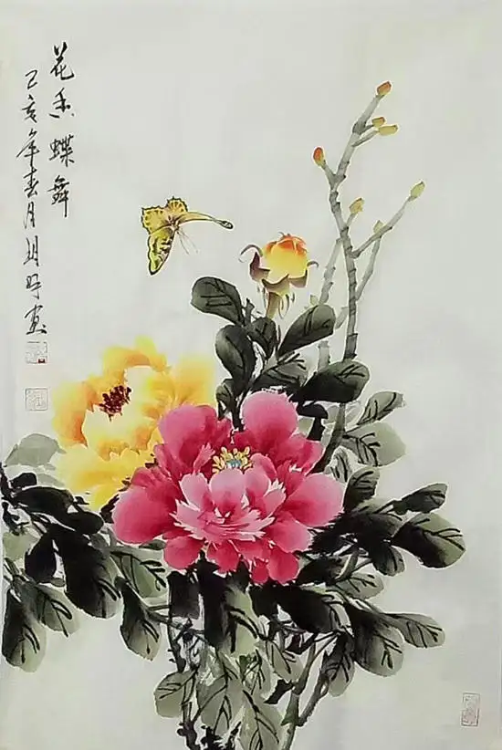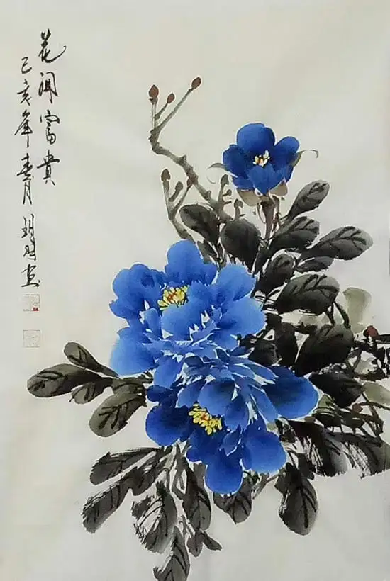 在她的花鸟作品中,牡丹与梅花是出镜率最高的题材,却被她画出了与众不同的韵味。画牡丹时,她摒弃了常见的浓艳俗媚,转而追求“雅俗共赏”的境界。她笔下的牡丹,花瓣层层叠叠,墨色浓淡相宜,既用厚重的笔墨表现花瓣的饱满丰盈,又以细腻的线条勾勒花脉的灵动飘逸;色彩上,或艳而不俗,或雅而不淡,朱红、粉白、嫩黄等色调在宣纸上交融晕染,宛如雨后初晴的牡丹园,暗香浮动,生机盎然。她注重捕捉牡丹的“神韵”,而非单纯描摹形态,枝干的苍劲、叶片的舒展、花朵的娇羞,都被她刻画得淋漓尽致,既展现了牡丹“花中之王”的雍容华贵,又传递出“富贵吉祥”的美好寓意。