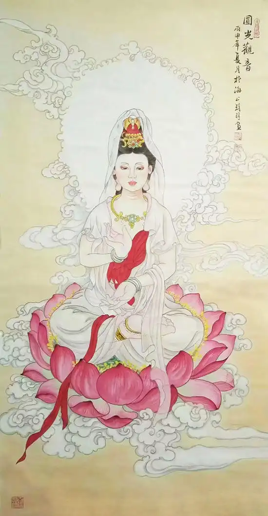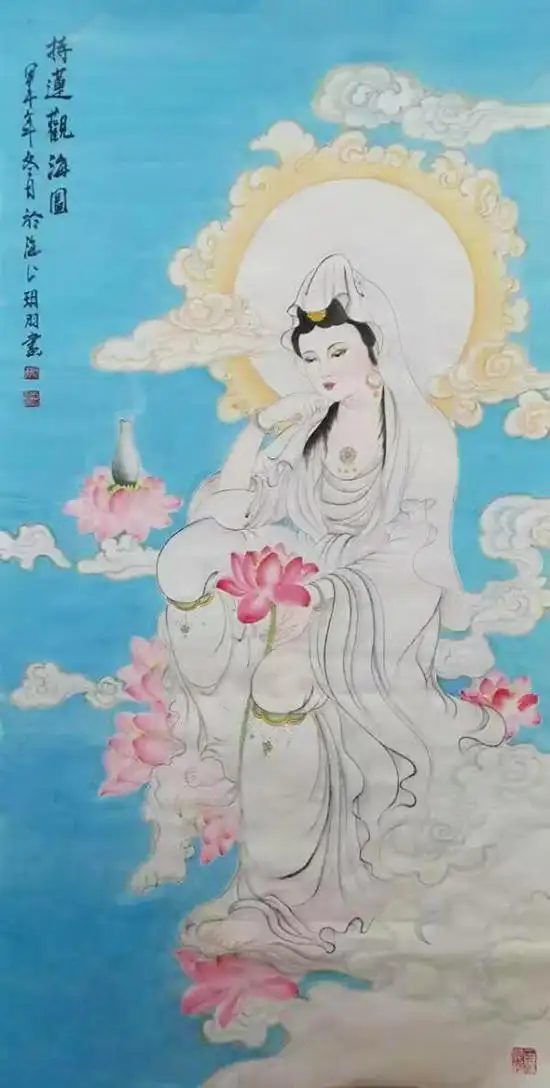 在人物题材的创作中,观音与弥勒佛是姜凤的拿手好戏,作品中满含禅意与温情。她画的观音,面容端庄慈祥,眼神悲悯柔和,衣袂飘飘如行云流水,线条细腻流畅,墨色清雅恬淡。她注重通过细节刻画传递观音的“慈悲为怀”,无论是手中的净瓶杨柳,还是眉宇间的温润神情,都让人感受到心灵的宁静与慰藉。而弥勒佛的形象则更为灵动鲜活,大肚便便,笑口常开,眉眼间满是豁达与洒脱。姜凤以夸张而不失分寸的笔法,勾勒出弥勒佛“大肚能容,容天下难容之事;开口便笑,笑世间可笑之人”的境界,色彩明快,笔触生动,既让人会心一笑,又引人深思,传递出乐观豁达的人生态度。