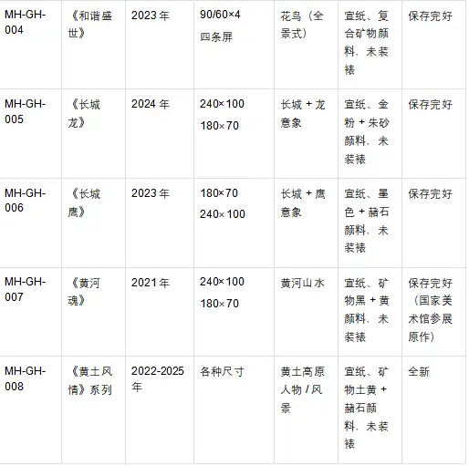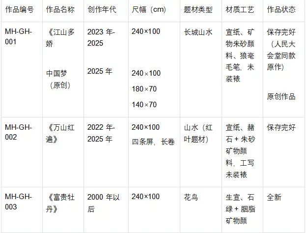 1.现状基础:所有作品均采用安徽泾县优质宣纸、矿物颜料创作,经专业装裱(绫绢、金卡纸、卷轴等),无破损、霉变、褪色,符合《美术馆藏品保管规范》(GB/T 30264-2013);