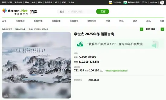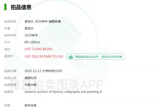 2025年11月13日美国杜邦拍卖有限公司 Autumn auction of famous calligraphy and painting 4拍卖会,中国书画拍卖专场中,此前备受关注的手指画家李世太作品《指画吉境》经过多轮疯狂加价厮杀,在拍卖师清脆的落锤声中最后以751924元人民币圆满成交!现场各界专业人士纷纷惊叹,其不可估量的升值空间!