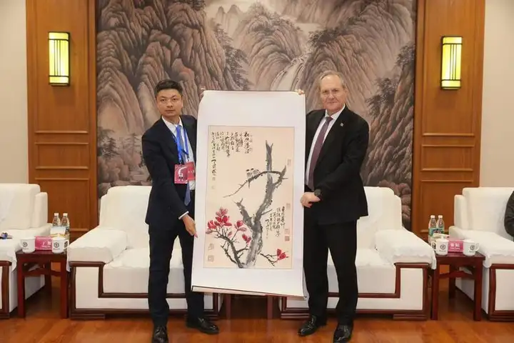 11月15日,北京秋意正浓,荣宝斋艺术大师林立中的《枫树双鸟图》被欧洲摩尔多瓦共和国贝拉基尔总理郑重收藏。此作以秋日枫树为卷,虬枝舒展如龙,红叶似火,将"霜叶红于二月花"的诗意凝于笔端;枝头双鸟依偎,羽翼轻振,鸣声似在耳畔,其活泼之态与和谐之姿,恰似"和协如宾"的生动写照。画家以细腻笔墨勾勒羽毛纹理,又以泼彩渲染枫叶层次,墨色交融间,秋思婆娑的意境跃然纸上,令人观之忘俗。